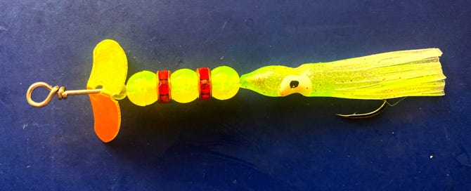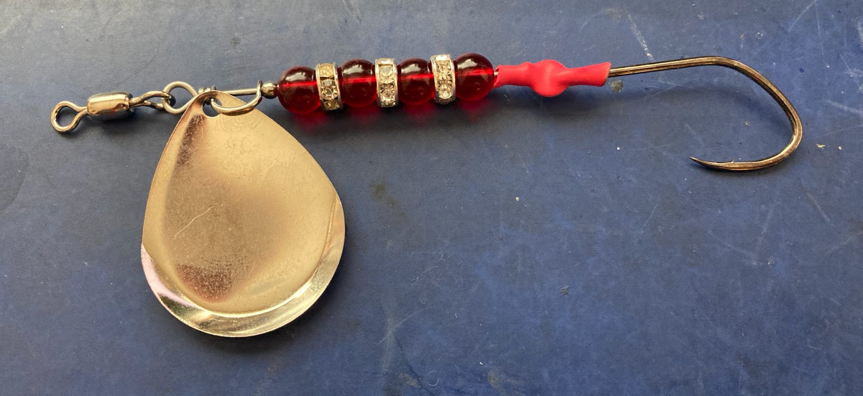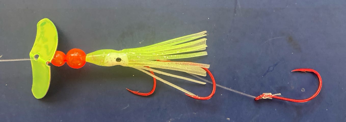 During the 2024 Brewster Pool salmon season, we field tested several versions of this lure and here is the final version. The lure has two 2/0 and one 1/0 red Gamakatsu octopus hooks-a trailing hook and two hooks inside the glow in the dark hoochie. The top hooks are tied with egg loop knots so you can easily attach a small piece of bait beneath the hoochie. The beads fluoresce, the hoochie glows in the dark, and the lure is topped with a mirror finish blade.