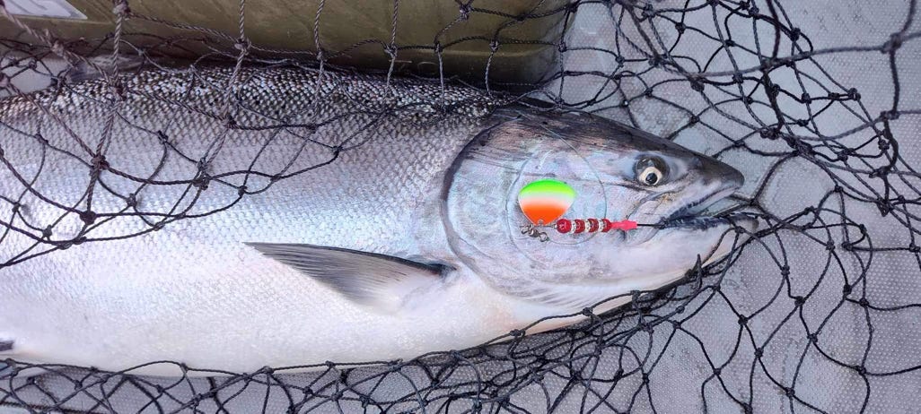 During the 2023 Brewster Pool salmon season, we tested several lure designs and here is the winning lure. I call it Xander’s Sockeye Special, named after ten year old Xander Black, who did most of the testing for me, and absolutely slayed the Sockeye (see below).