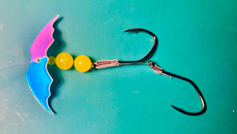 For plunking, the top hook has an egg loop knot for attaching a salmon egg cluster. Or, attach a prawn, or strip of tuna belly to the double hooks with Miracle Thread®. Notice how the hooks are tied so they face in opposite directions. This configuration results in 75-80% of your hookups with both hooks in the mouth.