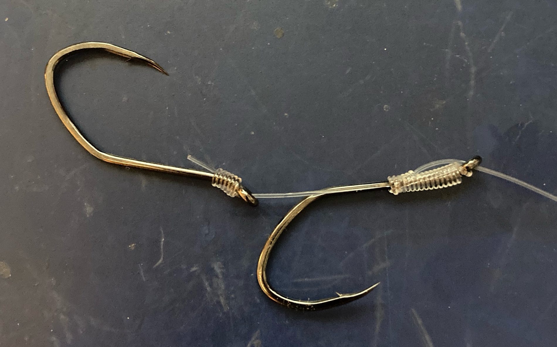 3. Two 3/0 Gamakatsu Big River, bait hooks, tied with the lower hook slightly below the upper hook and facing in the opposite direction from the upper hook. Note that the upper hook is tied with an egg loop knot.