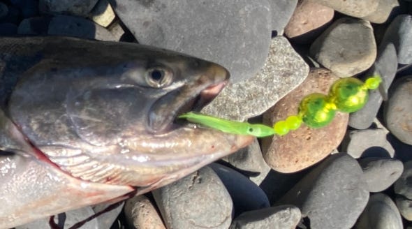 This has been my go to lure for Steelhead ever since I designed it in 2017. At the end of the day, I caught and released five wild fish, lost two and got a 15# keeper! I love this lure!