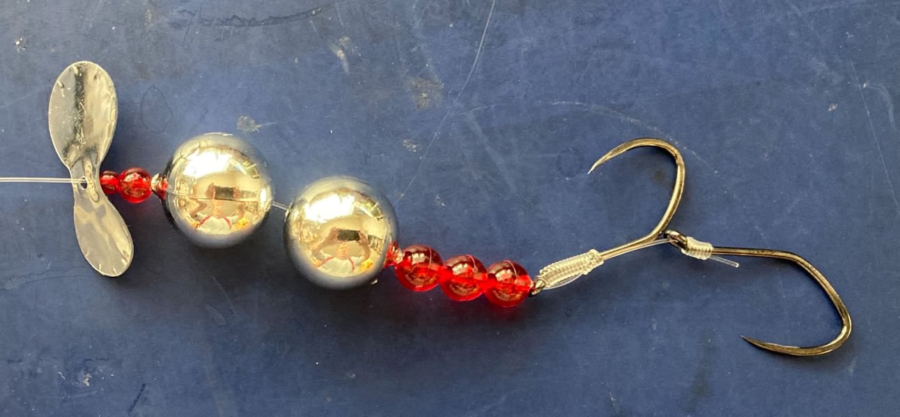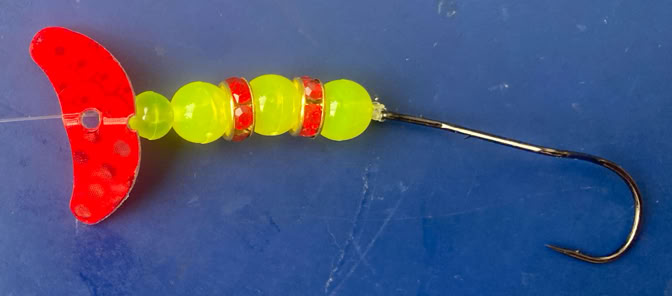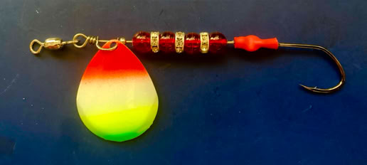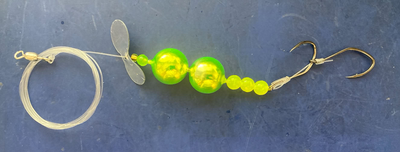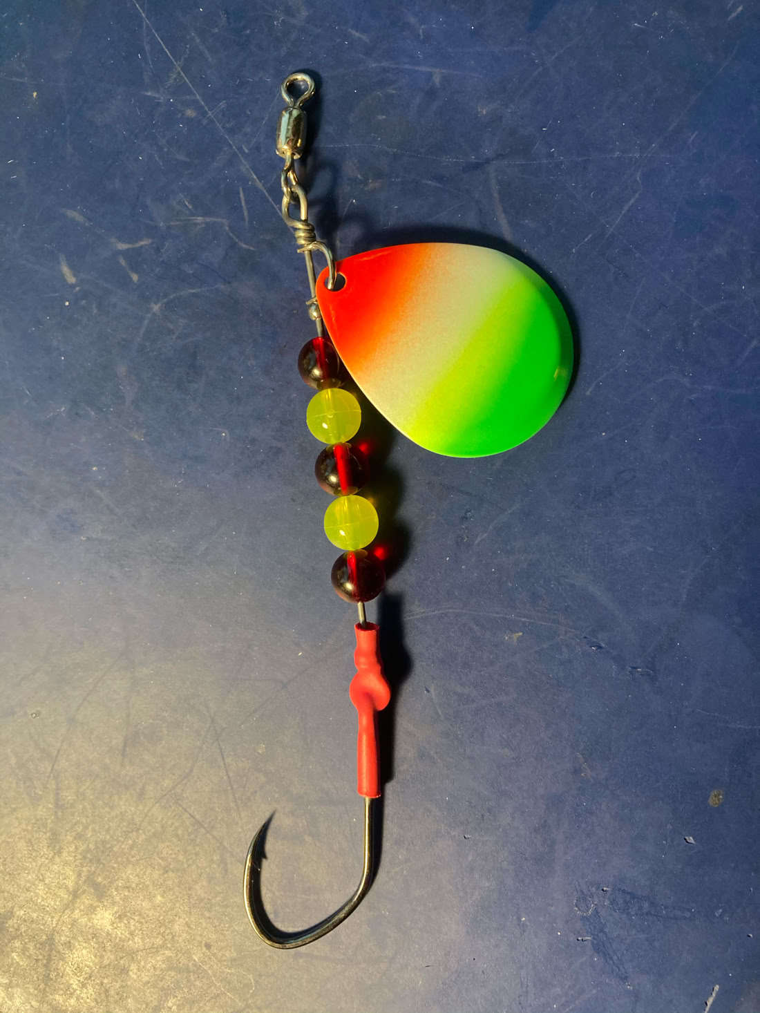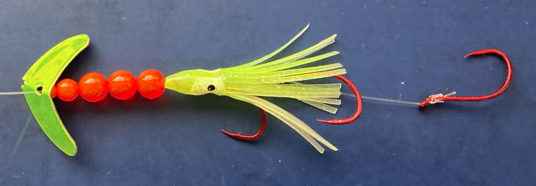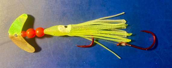 During the 2024 Brewster Pool salmon season, we field tested several versions of this lure and here is the final version. The lure has two 2/0 and one 1/0 red Gamakatsu octopus hooks-a trailing hook and two hooks inside the glow in the dark hoochie. The top hooks are tied with egg loop knots so you can easily attach a small piece of bait beneath the hoochie. The beads fluoresce, the hoochie glows in the dark, and the lure is topped with a mirror finish blade.