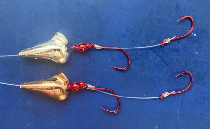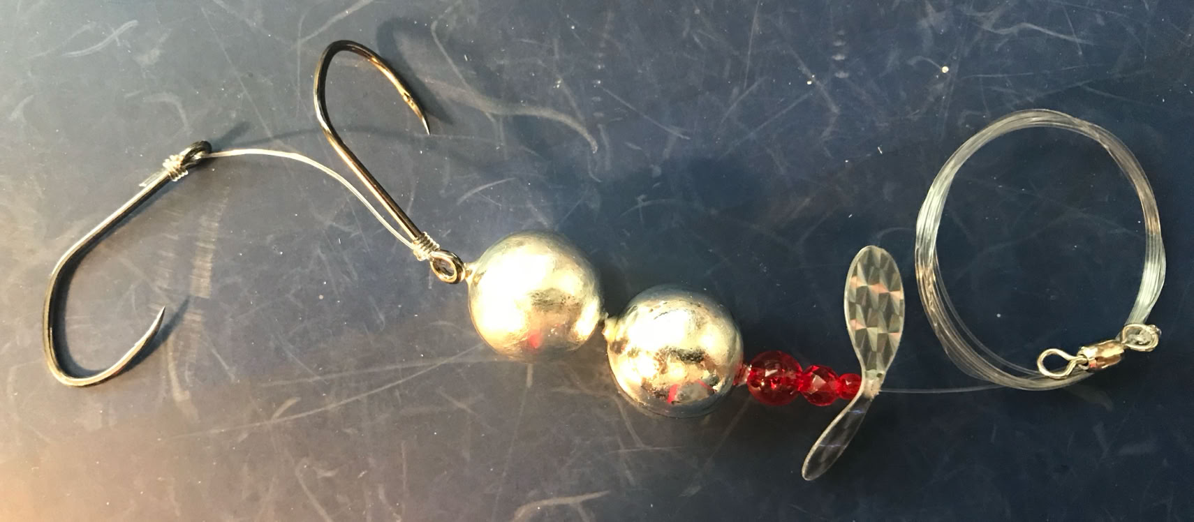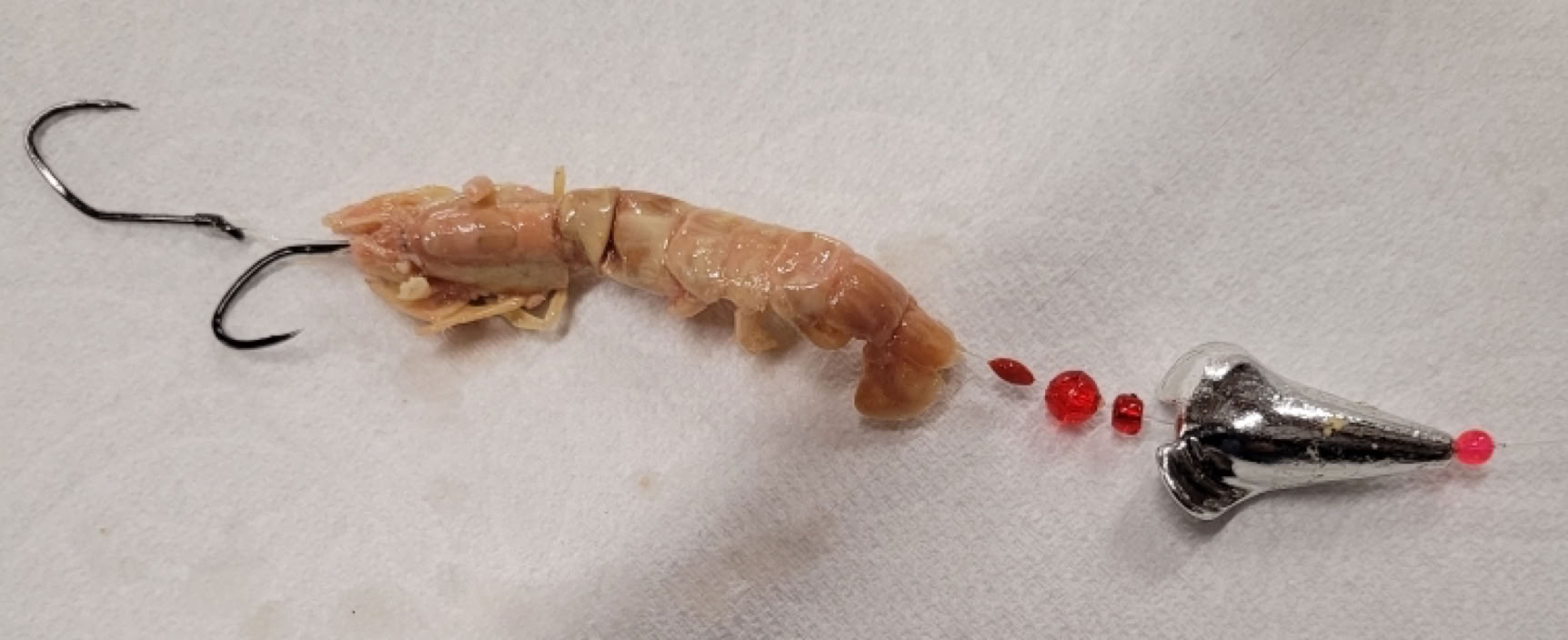 Brian S. says, “This is how I rig up a sand shrimp on the Top Prop Plunking Lure. I remove the corkies, the lure and beads. I then slide a red bobber stop about 3” above the hooks. Then I thread the sand shrimp on a needle and then on to the line. I then put the lure back together minus the corkies. I try to keep about 4 sand shrimp setups rigged up so I can swap it out when the bait needs changing.