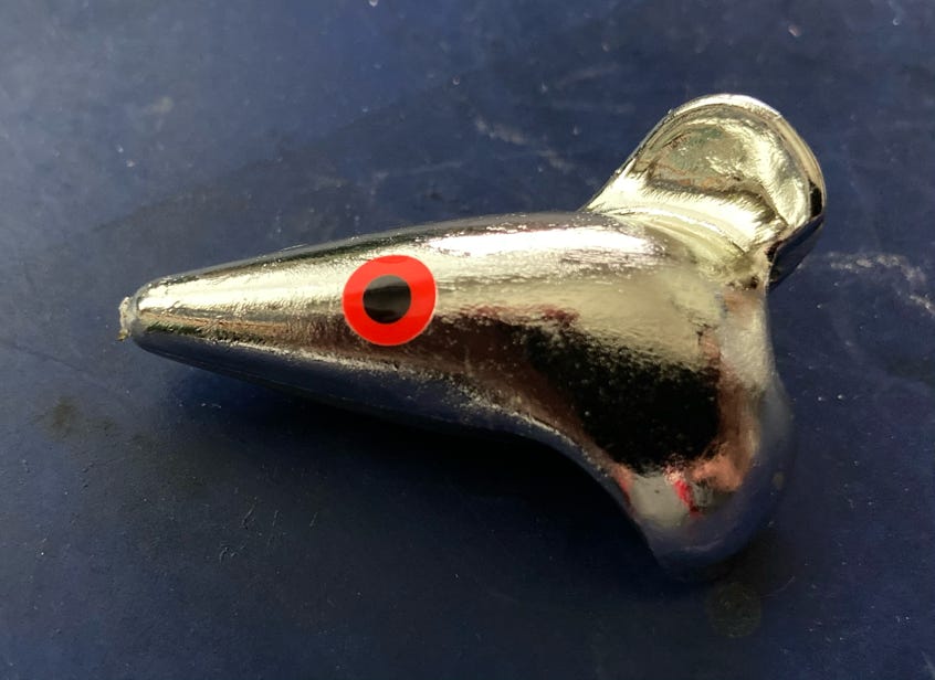 Even though the chrome plating on the body of the lure has been destroyed by fish strikes and hitting the bottom, it continues to attract fish, because the plating on the tiny wings is undamaged.