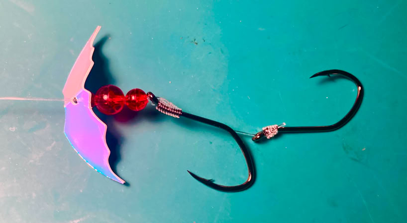 For plunking, the top hook has an egg loop knot for attaching a salmon egg cluster. Or, attach a prawn, or strip of tuna belly to the double hooks with Miracle Thread®. Notice how the hooks are tied so they face in opposite directions. This configuration results in 75-80% of your hookups with both hooks in the mouth.