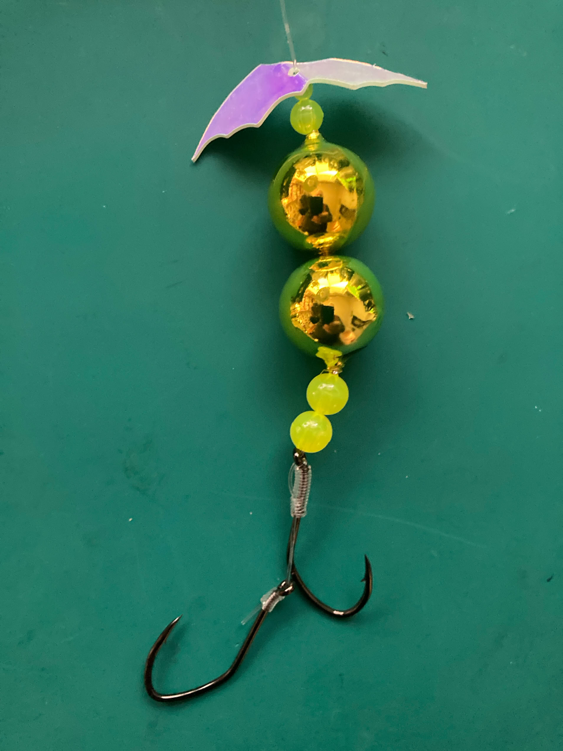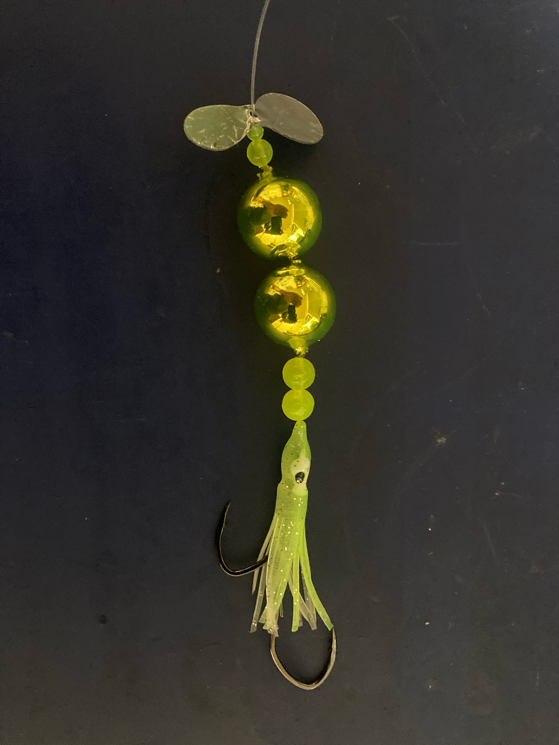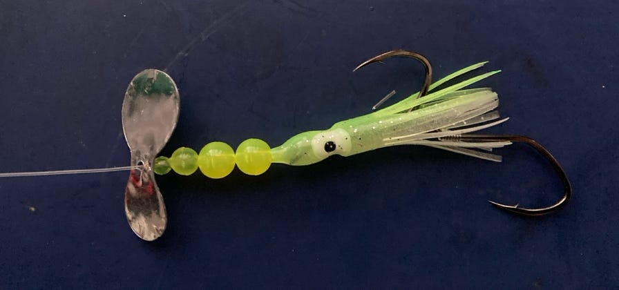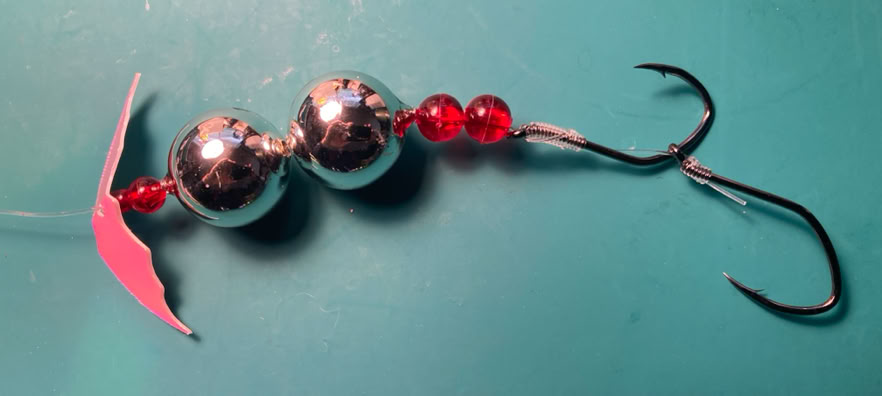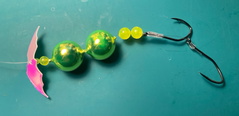 For trolling, remove the Lil’ Corkys® (leaving the beads), and attach an egg cluster in the egg loop knot on the top hook, or a prawn or a strip of tuna belly to the double hooks with Miracle Thread®. Trolling speed should be 1.6+ mph.