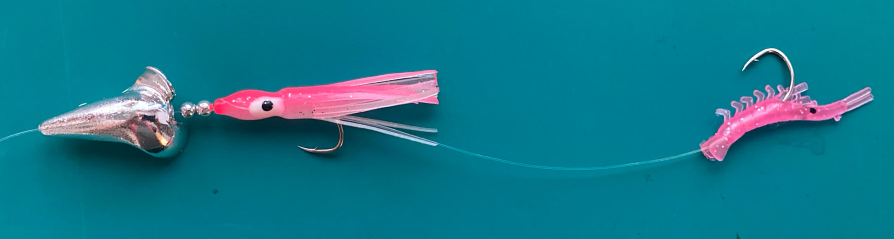 The Shrimp Snack is crafted with two Gamakatsu #1 octopus hooks. Attach small piece of shrimp on the top hook.